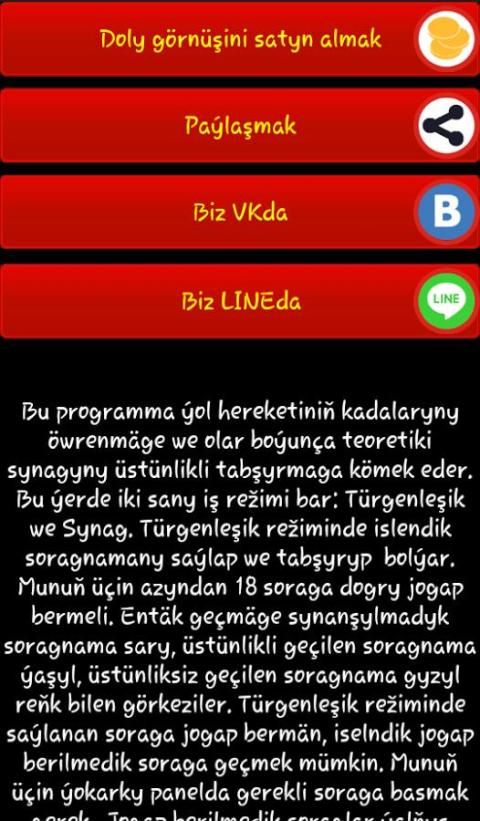 Bu programma Ýol Hereketiniň Kadalaryny öwrenmäge we olar boýunça teoretiki synaga taýynlanmaga kömek edýär. Bu ýerde iki sany iş režimi bar: Türgenleşik we Synag.