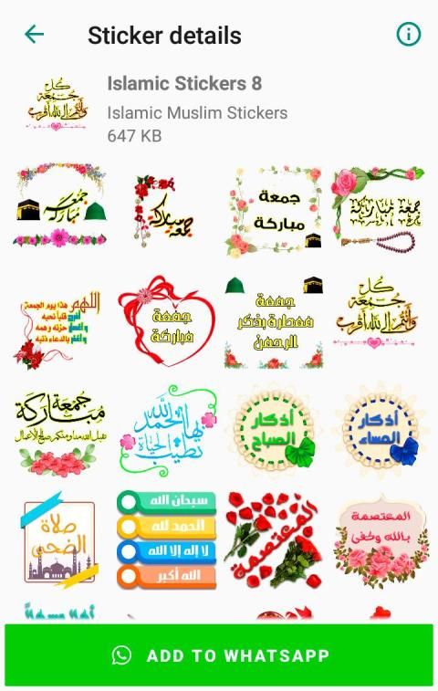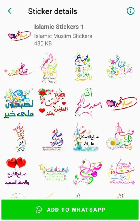 Aplikasi stiker WhatsApp berisi banyak stiker Islami yang indah yang dibagi menjadi banyak kategori berbeda, misalnya, poster ucapan selamat untuk Jumat dan Selamat Pagi, selamat malam, di samping stiker doa WhatsApp dari Al-Quran yang murah hati.