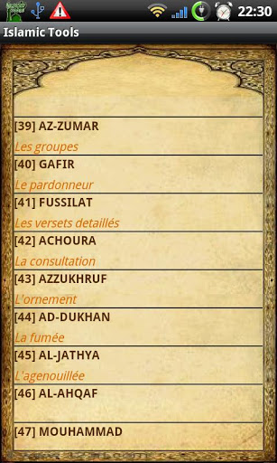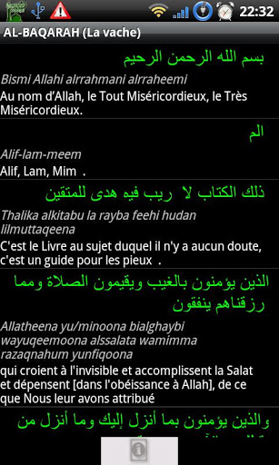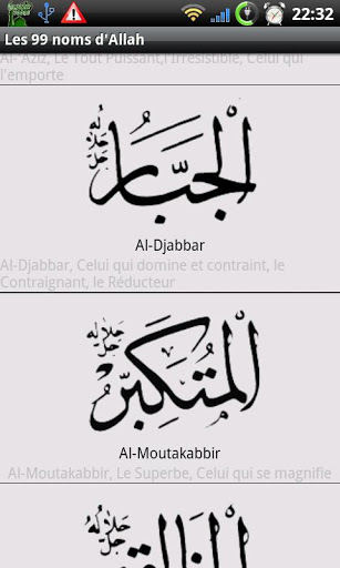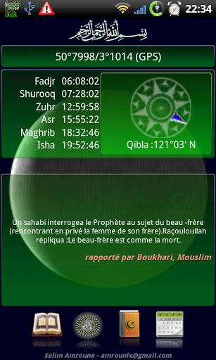 This program included several tools for Muslim: schedule of Prayer 9600 Cities GPS Monthly calendar of prayer times Qibla Locator with compass Random Hadith quotation on the screen Quran in Arabic, French English, Phonetics Tafsir of Surahs Quran recitation Choice of famous reciters Downloading of Surahs 99 Names of Allah Several books: 40 Hadiths Anawawi, Sahih Muslim, Friday SermonsMuslim Holiday Calendar Widget: Prayer Times amp; display a random Hadith quotationNotification call to prayer Moon phases Wallpaper Changing themes only background color for the moment A lot of part was written in French, I will translate it as soon as possible.LAST information : The Quran in English in my software is incorrect All Surahs are shifted because they don39;t start byquot;Bismillah y rahmane y rahimquot;, I39;ve correct it on the next version amp; I will publish it quickly inchaAllah.Note: Downloading Surah is a bit capricious in Android Timeout too short?, You will sometimes retry the download to get it, I will try to correct it in the next version inshaAllah. Thank you for your comments, May Allah always guide us to the straight path inshaAllah.