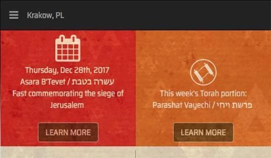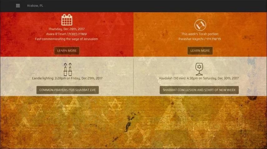 App juga menunjukkan Liburan Yahudi yang masuk dan memberikan info tentang doa, pembacaan Taurat dan kebiasaan untuk Liburan, Shabbat dan Havdalah.