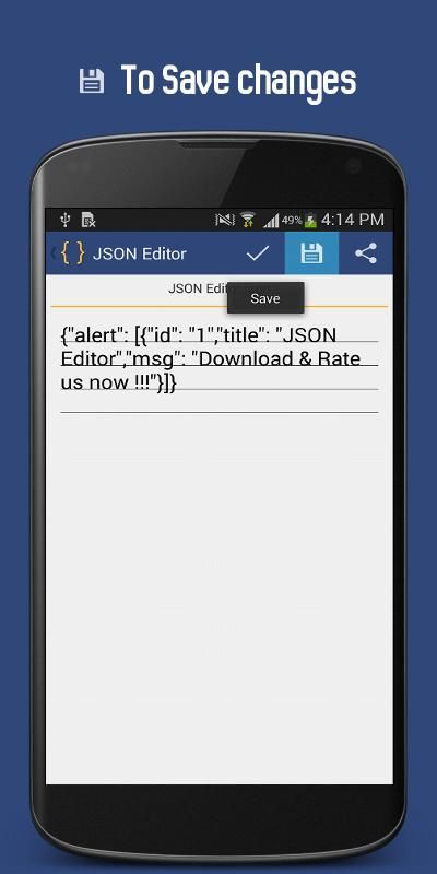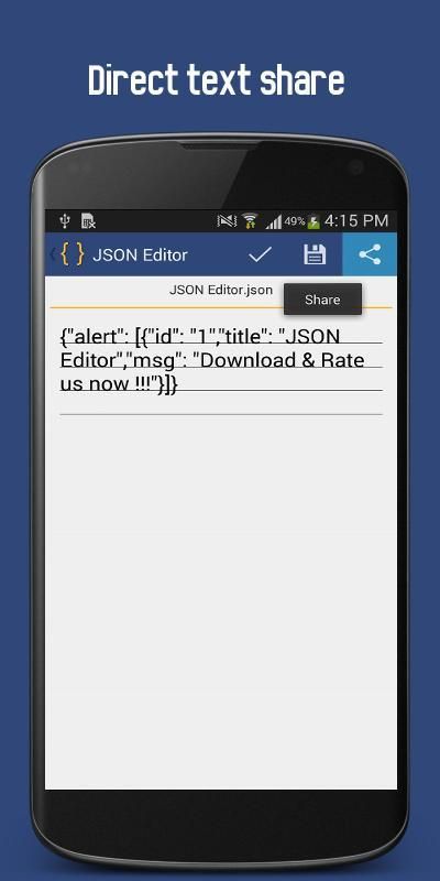 daftar aplikasi semua file JSON hadir di ponsel. Kita dapat menggunakan aplikasi ini untuk Buat, Edit, Download, Validasi dan Share (teks) file JSON.