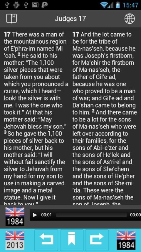 Anda dapat mendengarkan rekaman audio dari bab dalam semua bahasa. Tombol putar terletak di bagian bawah (dalam versi bahasa Inggris baru tahun 2013, audio belum tersedia) Dari menu di sisi kanan, klik download untuk mendownload mp3 pada perangkat Anda