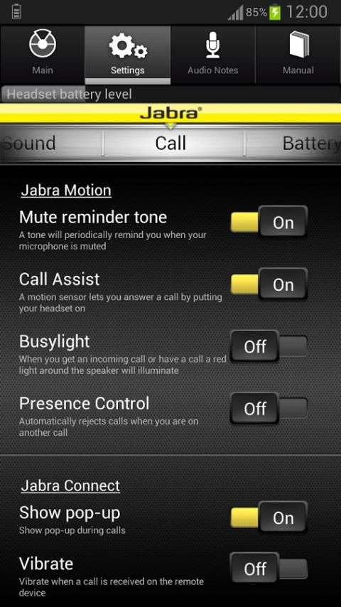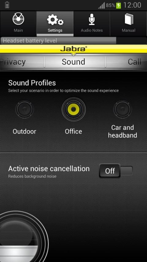 Selanjutnya aplikasi memungkinkan Anda memilih antara tiga profil yang berbeda, untuk memastikan Anda memiliki pengaturan suara yang sempurna berdasarkan mana Anda berada di kantor Anda, di luar ruangan atau di mobil Anda. Halus, antarmuka visual yang intuitif app memungkinkan Anda melihat berapa banyak baterai yang tersisa pada headset di layar smartphone Anda untuk mengingatkan Anda bila waktu untuk mengisi ulang. Menggunakan aplikasi ini, Anda bahkan dapat merekam catatan audio, menyimpannya di aplikasi Anda dan berbagi mereka melalui email atau aplikasi terinstal lain mampu menerima file. Sebuah fitur baru yang disebut Cari Jabra saya dapat membantu Anda menemukan headset hilang. Ketika diaktifkan, ia akan menyimpan posisi mana headset telah digunakan terakhir dan menampilkannya pada peta. Dalam kasus headset masih terhubung, gunakan Cari Jabra saya untuk mengirim nada Beacon untuk headset untuk menemukan dengan telinga.