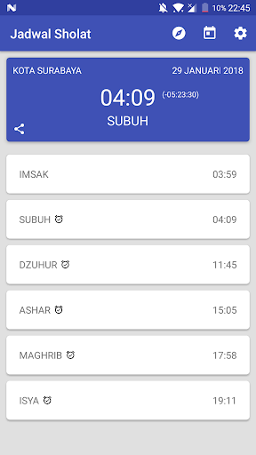 Menampilkan jadwal sholat saat ini (Subuh, Dzuhur, Ashar, Maghrib, dan Isya) dan ditambah waktu Imsak. Serta disediakan widget countdown (hitungan mundur) waktu sholat.