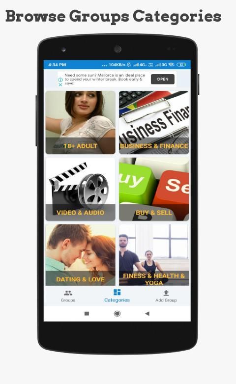 Grup disaring berdasarkan kategori sehingga mudah bagi semua orang untuk menemukan grup yang sesuai sesuai minat pengguna