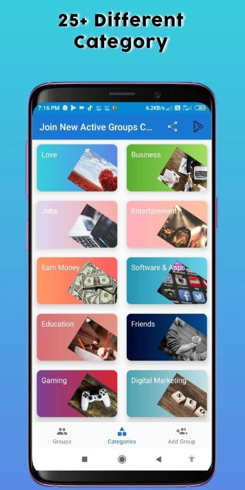 Now Share And Join New Active Groups And Channels in One App. You Can Join Unlimited Groups And Channels from 25+ Different Categories. If You Having Any Groups Or Channels On Social Media Apps, Then You Can Also Share Your Links In This App To Get New Member For Free.