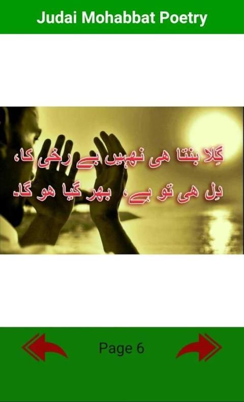 Judai Mohabbat Puisi adalah aplikasi terbaik Urdu Poetry Anda pasti akan menikmati ini. Koleksi terbaik Judai Mohabbat Puisi yang pernah Anda baca dalam hidup Anda.