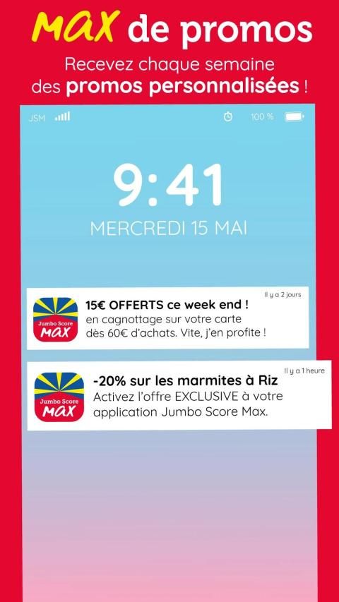 Avec la nouvelle appli Jumbo Score Max, fini les bons de réduction papier qui dépassent dans votre portefeuille. Fini les tickets de caisse perdus ! Faites le ménage dans votre portefeuille et profitez de tous vos avantages fidélité à portée de main !