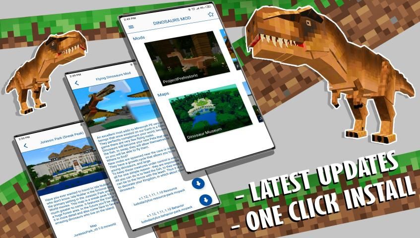 The app is very easy to use, it allows you to install mods and maps without additional programs. You just need to click on the download button of the mod or map, and then click on the install button and that's all! Dinosaurs have different sizes and behave differently. Make the game more interesting with these additions and modifications! Good luck in the endless world of fun and danger, dinosaurs are waiting for you!