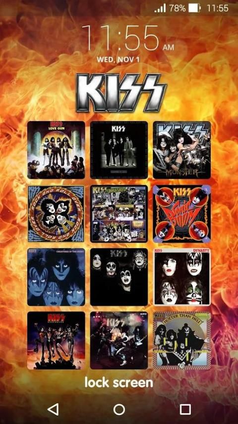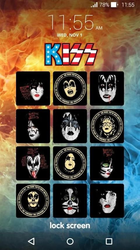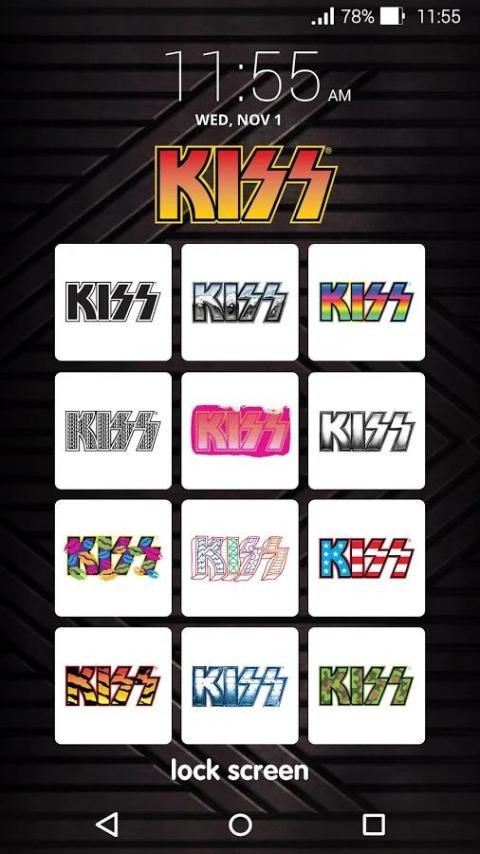 KISS Lock Screen memungkinkan Anda membuka kunci perangkat Android Anda menggunakan Picture Password pada sebuah tombol yang menampilkan gambar dari Band Hottest di Dunia - KISS.