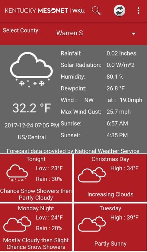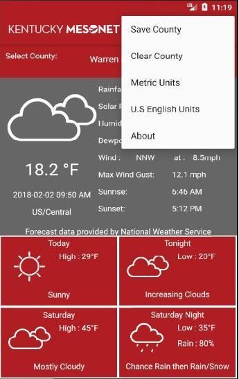• Use your phone’s built-in location services to determine the closest Kentucky Mesonet station or select a default station.