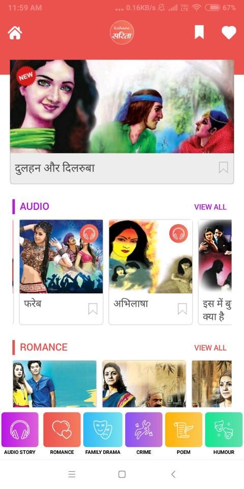 "Kahani Sarita" is an app by the Delhi Press Group. On this app, you can read stories featured in the publications of the Delhi Press, which includes leading magazines like "Sarita", "Grihshobha", "Mukta", "Saras Salil", "Manohar Kahaniyan" and "Satyakatha". Among these stories, you will get to read romantic stories, crime fiction, family drama, poetry, satire, and non-fiction. Through these heartwarming stories, the readers will feel a sense of freshness, enthusiasm and passion, with each story.