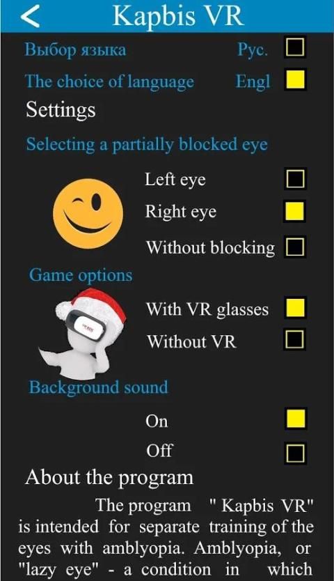 Program «Kapbis VR» dirancang untuk mata pelatihan yang terpisah dengan amblyopia. Amblyopia, atau "mata malas" - suatu kondisi di mana terjadi penurunan ketajaman visual, sensitivitas gangguan dan kemampuan akomodatif mata. Kondisi ini mengarah pada fakta bahwa mata yang lemah secara bertahap dikeluarkan dari visi dari proses di tingkat otak, dan pria itu hampir melihat dengan satu mata dan tidak dapat melihat gambar tiga dimensi.