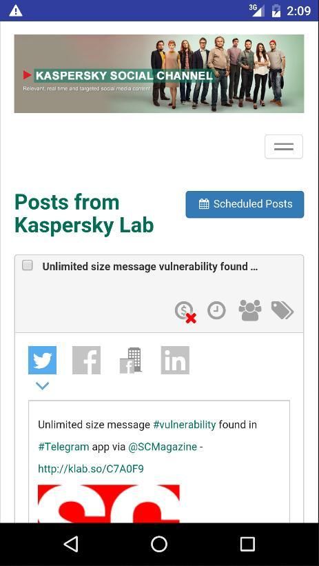 Kaspersky Sosial Channel adalah perusahaan kelas dunia solusi sindikasi sosial yang memungkinkan Kaspersky mengaktifkan sosial pendukung mereka - karyawan, mitra penjualan, infleuncers dan duta merek lainnya. Konten dibagi melalui aplikasi untuk para pendukung yang dapat, pada gilirannya, berbagi konten ini melalui saluran sosial mereka sendiri.