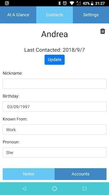 Keep In Touch adalah aplikasi yang agak sederhana yang memungkinkan Anda menyimpan catatan di bawah kontak. Jika catatan menyertakan tanggal di masa depan, itu ditambahkan ke jadwal yang akan datang. Anda juga dapat menyimpan informasi akun seperti email dan akun media sosial sehingga Anda tidak perlu bertanya-tanya siapa lagi xxx_BigFerrari1990_xXx.