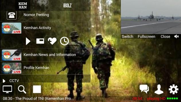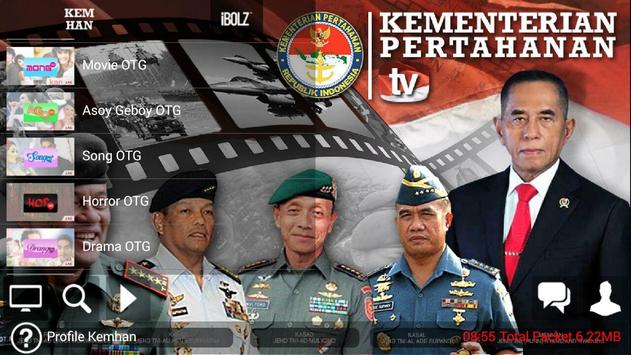 Kementerian Pertahanan Republik Indonesia bekerjasama dengan iBOLZ Indonesia menghadirkan Kementerian Pertahanan TV yang berisi ragam informasi berupa tayangan video yang dapat disaksikan hanya melalui layar smartphone. Video yang ditayangkan berupa informasi mengenai kegiatan yang dilakukan oleh Tentara Nasional Indonesia serta tayangan hiburan melalui channel musik dan film. Selain itu para pengguna aplikasi ini dapat berkomunikasi melalui media chatting sambil menyaksikan tayangan video pilihan. Bagi Anda yang ingin mengetahui informasi terbaru serta berbagai kegiatan yang dilaksanakan oleh barisan Tentara Nasional Indonesia maka semuanya bisa didapatkan dengan mendownload aplikasi Kementerian Pertahanan Republik Indonesia.