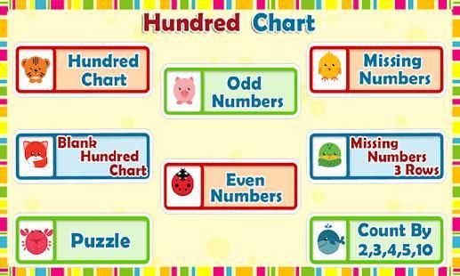 5) Missing Numbers. Kids can set the number of missing numbers in the hundred chart. There are three levels - Easy, Medium, Hard