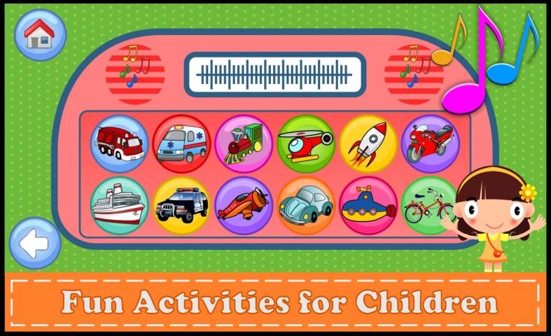 Kendaraan untuk kategori anak-anak prasekolah akan membantu anak-anak mengenali kendaraan populer; mobil, sepeda, ambulans, pesawat terbang, truk, kapal, firetruck, sepeda motor, kereta api, mobil polisi, helikopter, bus, roket, van dan kapal selam dll.