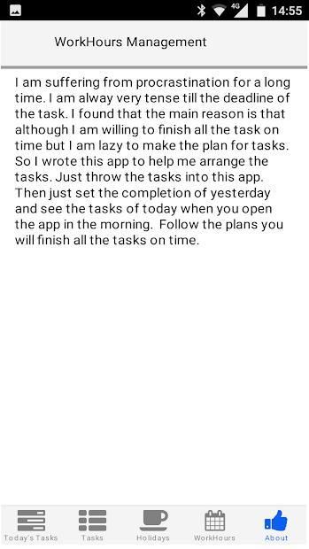 I am suffering from procrastination for a long time. I am alway very tense till the deadline of the task. I found that the main reason is that although I am willing to finish all the task on time. But I am lazy to make the plan for tasks. So I wrote this app to help me arrange the tasks. Just throw the tasks into this app. Then just set the completion of yesterday and see the tasks of today when you open the app in the morning. Follow the plans you will finish all the tasks on time.