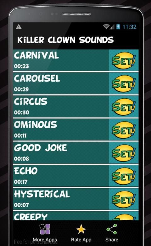 Mempersiapkan beberapa hasil suara menakutkan dari si pembunuh badut suara-suara aplikasi, dan melepaskan tawa ringtones badut jahat di ponsel Anda. Bagi individu yang mencintai nada menyeramkan nada dering ini pembunuh badut dan nada badut jahat akan menjadi ringtones terbaik untuk android. badut jahat dan badut pembunuh kami menerima mereka semua dalam ketakutan terdengar aplikasi ringtone, yang merupakan program yang mengagumkan untuk Halloween. Lengkapi ponsel Anda dengan Evening nada dering dari ini suara-suara aplikasi, dan menggunakan nada dering badut jahat atau nada dering badut fantastis sebagai nada Anda untuk mobile atau pemberitahuan suara. ringtones badut jahat akan cukup sempurna bagi siapa saja yang mencari beberapa menakutkan aplikasi suara, dan suara-suara badut besar sedang menuju untuk menjadi cukup besar sebagai alarm berbunyi.