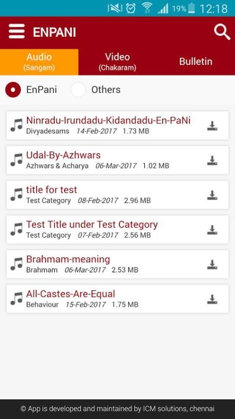 Aplikasi ini, En Pani, bagian dari Kinchitkaram Trust, adalah di mana U.Ve. Velukkudi Krishnan Swamy berbicara tentang berbagai subjek yang menarik untuk anggota. Silakan berbagi masukan Anda menggunakan Masukan link yang tersedia di aplikasi itu sendiri.