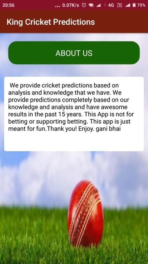 Aplikasi King Cricket Predictions memberikan tips cricket untuk prematch juga memberikan tips & prediksi untuk hiburan di ODI, T20 dan juga untuk liga seperti IPL, BIgBash, CPL, SPL.