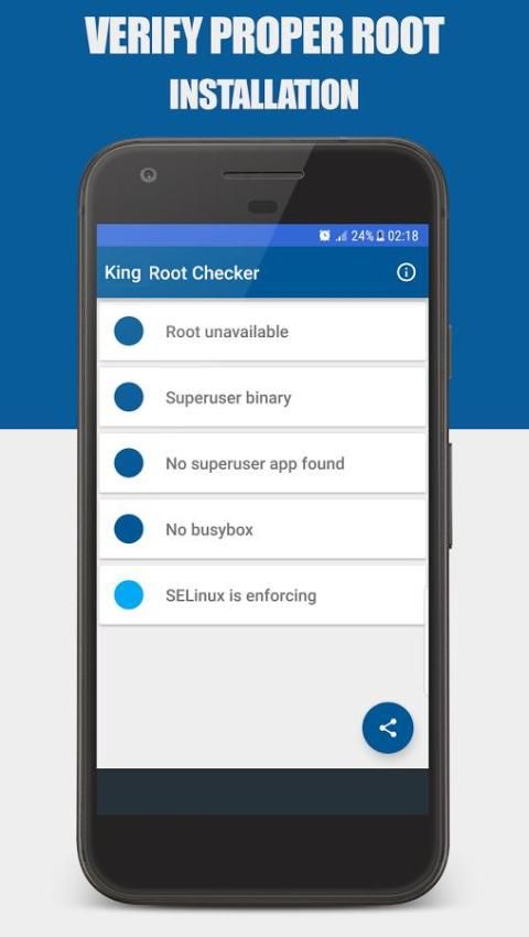 Aplikasi ini menyediakan pengguna Android dengan metode sederhana untuk memeriksa akar perangkat mereka dan panduan tentang cara untuk membasmi menggunakan KingRoot, itu akan menguji perangkat untuk root (superuser) akses menggunakan cepat.