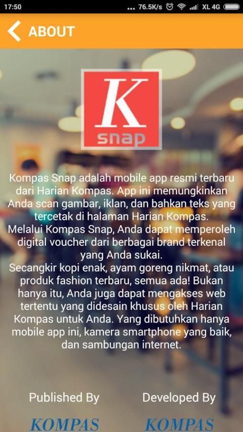 Kompas Snap adalah mobile app resmi terbaru dari Harian Kompas. App ini memungkinkan Anda scan gambar, iklan, dan bahkan teks yang tercetak di halaman Harian Kompas. Melalui Kompas Snap, Anda dapat memperoleh digital voucher dari berbagai brand terkenal yang Anda sukai. Secangkir kopi enak, ayam goreng nikmat, atau produk fashion terbaru, semua ada!