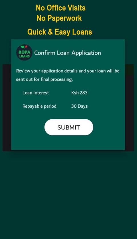 Kopa makes getting a personal loan simple by using the data on your phone including your SMS history to verify your identity and create a credit score. We encrypt the data you choose to share with us to protect your privacy. We take your privacy very seriously and promise to never share your information with third parties.