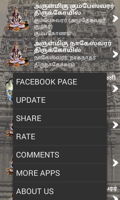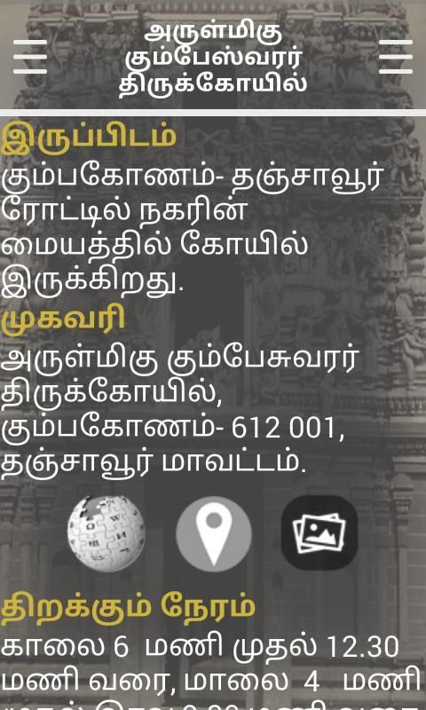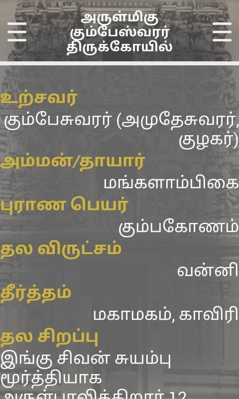 Ini memiliki lebih dari 50 Kumbakonam dan kuil-kuil dikelilingi rincian dan lokasi. Ini adalah kuil-kuil kuno berusia lebih dari 1000 tahun. Aplikasi ini tersedia candi Navagraha, siva dan kuil-kuil vishnu.