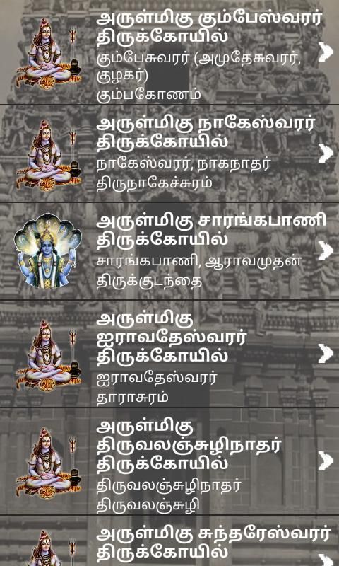 It has more 50 kumbakonam and surrounded temples details and location. These are more than 1000 years old ancient temples. This app provided navagraha temples, siva and vishnu temples.