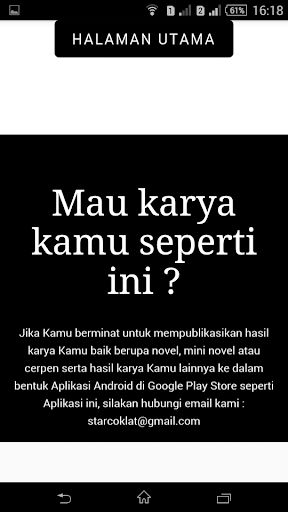 Jika Kamu berminat untuk mempublikasikan hasil karya Kamu baik berupa novel, mini novel atau cerpen serta hasil karya Kamu lainnya ke dalam bentuk Aplikasi Android di Google Play Store seperti Aplikasi ini, silakan hubungi email kami : starcoklat@gmail.com