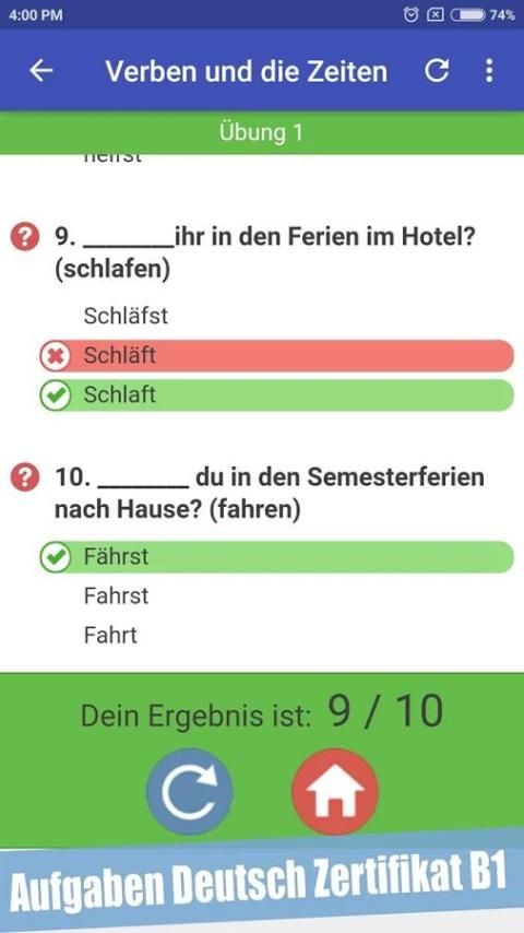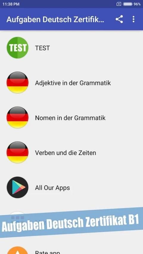 Grammar ujian tugas B1 adalah - Aplikasi untuk berlatih kata-kata sulit dari bahasa Jerman. Di sini Anda akan menemukan latihan tata bahasa, seperti empat kasus (kasus), preposisi atau konjungsi. Latihan memiliki tingkat Jerman B1.