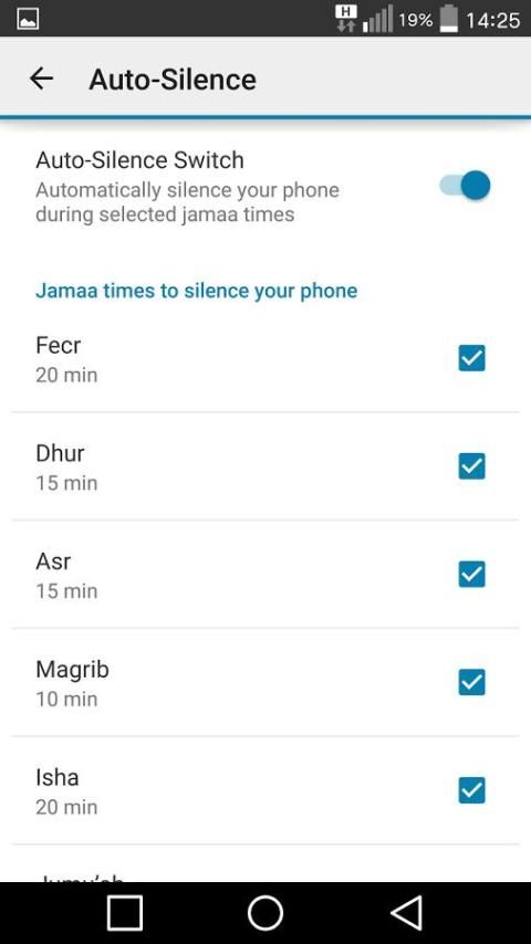 Fitur ini keheningan telepon Anda selama Anda disukai kali jamaa jika diaktifkan. Anda bisa mengatur durasi hening untuk setiap doa dan untuk doa Jumuah juga. Begitu pilihan Anda periode diam selesai, ponsel akan kembali ke profil suara sebelumnya yang biasa Anda gunakan.