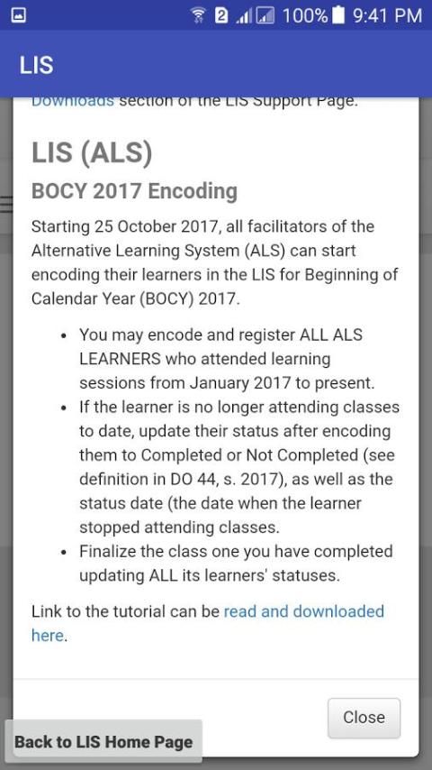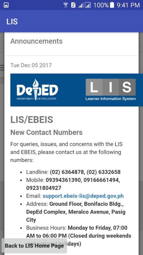 The LIS adalah alat inovatif yang menggunakan Departemen untuk mengelola informasi dengan tujuan mempromosikan transparansi, pengambilan keputusan, dan pemberdayaan pada tingkat yang berbeda dari organisasi. Sementara menjadi solusi berbasis teknologi, yang LIS melibatkan proses inklusif, berbasis masyarakat yang tumbuh subur karena keterlibatan aktif dan partisipasi dari semua guru, kepala sekolah, petugas perencanaan dan personil lainnya DepEd di seluruh Filipina.