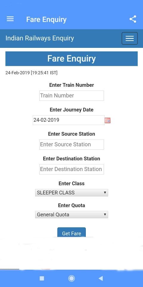 5. Fare Enquiry - By Fare Enquiry, dapatkan Fare of Train dari sumber ke tujuan dengan Kereta yang dipilih. Dengan Memberi rincian usia jika Anda warga negara senior, akan dikenakan biaya lebih murah.
