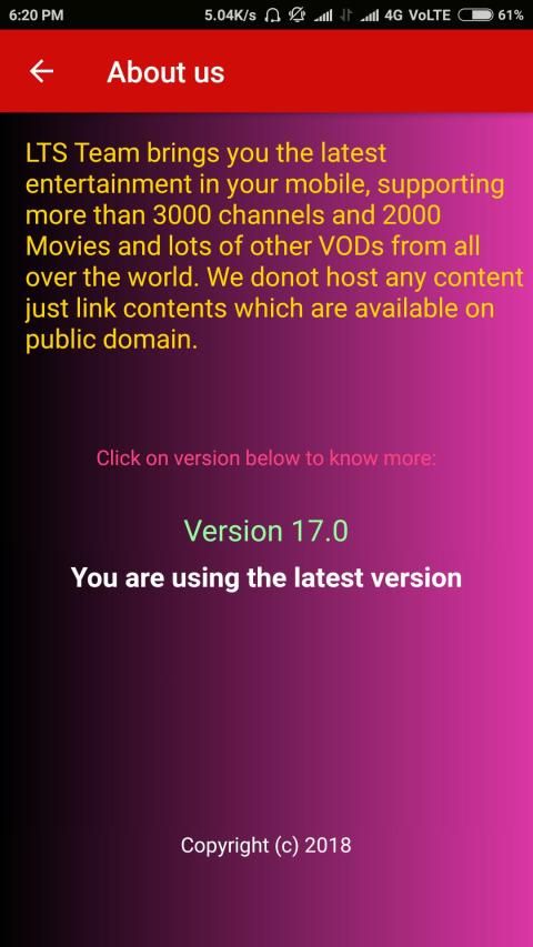 As we all know, 20,000+ users downloaded LTS TV latest version on 9Apps for free every week! Once you've used it, you'll be attracted. This hot app was released on 2018-12-29. Why not download and have a try?
