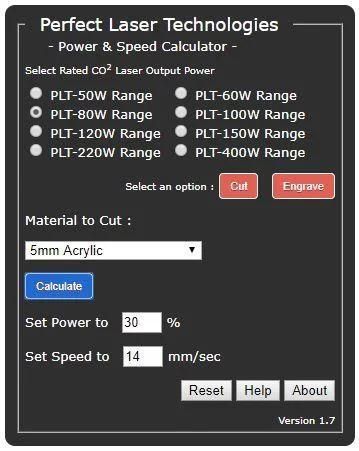 Untuk menggunakan kalkulator ini, klik Anda Rated Laser Power Output, kemudian pilih Cut atau Engrave, dan kemudian materi yang Anda berniat untuk menggunakan.