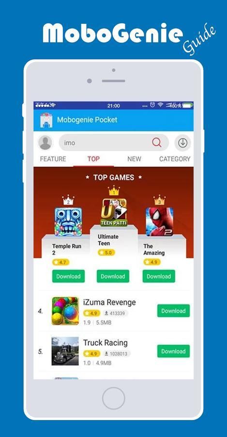 HELLO HELLO .... Selamat datang di Panduan baru Untuk Mobogenie ... New mobogenie pro 2017 memberikan Anda uptop, gratis aplikasi mobo toko jin dikategorikan pada kedua toko aplikasi gratis mobogenie bersama-sama Free dan Paid ... Ya .. Dengan toko toko bebas aplikasi mobogenie dari mobo jin Anda bisa mendapatkan baru dari android toko mobogenie gratis terbaik aplikasi gratis di google play store di satu tempat ... jadi download sekarang dan menikmati ... Anda harus sekarang bahwa setelah Anda men-download panduan untuk toko mobogenie Anda akan memeriksa setiap app store peringkat di semua negara seperti Amerika Serikat dan canada dan Arabie Saudi ... dan atas peringkat app store dan Anda akan menemukan banyak kategori seperti bermain toko google, Anda akan menjelajahi toko aplikasi baru dan atas setiap hari.