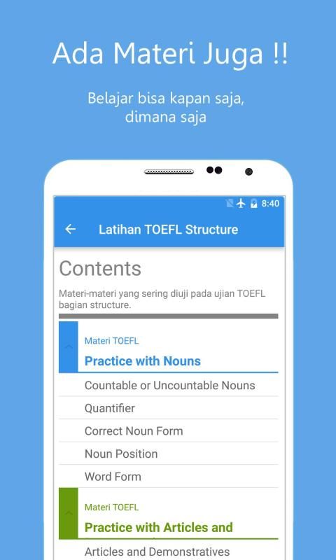 Applikasi ini bertujuan untuk membantu Anda untuk berlatih structure kapan saja dan dimana saja Anda berada. Anda dapat melatih sejauh mana kemampuan anda untuk 'Part A: Incomplete sentences' maupun 'Part B: Incorrect words' secara terpisah dan melihat pembahasannya. Apabila anda sudah yakin dengan kemampuan anda, ujilah melalui tes simulasi yang juga disediakan.