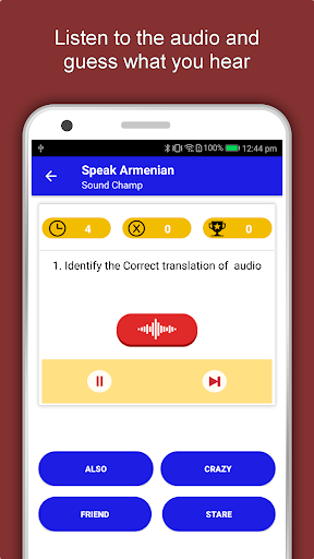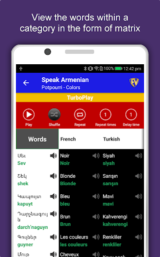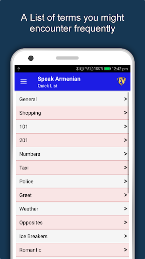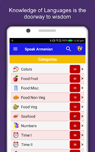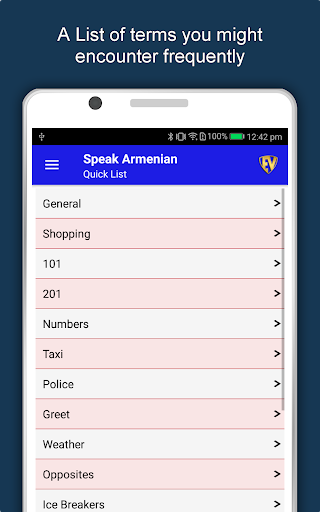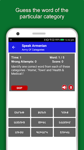 Aplikasi Pembelajaran Armenia Offline memiliki 2.135 kata dengan 55 kategori. Ini berisi pengucapan, gambar, dan fonetik kata untuk pembelajaran yang mudah. Beralih Bahasa Basis, Simpan pembelajaran di Edubank℠, permainan audio, percapian dan game retensi adalah fitur utama aplikasi Speak Armenia.