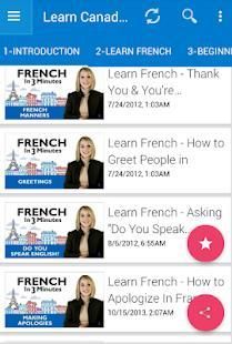 - Pelajari Perancis Kanada dengan pelajaran gratis setiap hari. Mari Mondly mengajarkan bahasa Perancis Kanada dengan cepat dan efektif. Dalam beberapa menit saja Anda akan mulai menghafal inti kata-kata Perancis Kanada, kalimat bentuk, belajar berbicara frase Perancis Kanada dan mengambil bagian dalam percakapan.