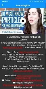 EnglishClass101.com adalah situs web pembelajaran bahasa Inggris online. Bersama kami Anda akan belajar berbicara, membaca, dan menulis bahasa Inggris. Anda akan bersenang-senang belajar dengan pendengar di seluruh dunia. Bersiaplah untuk "wow" teman, keluarga, guru, dan kolega Anda dengan bahasa Inggris yang akan Anda pelajari bersama kami!