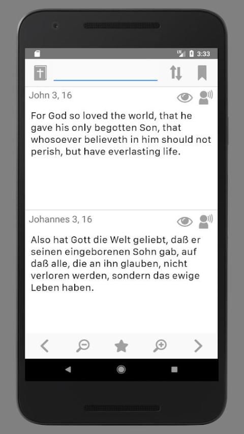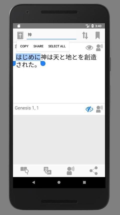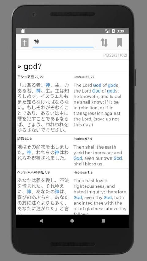 - Terjemahan Instan: Biarkan aplikasi mencoba untuk menerjemahkan kata apapun menggunakan teks Alkitab penuh.
