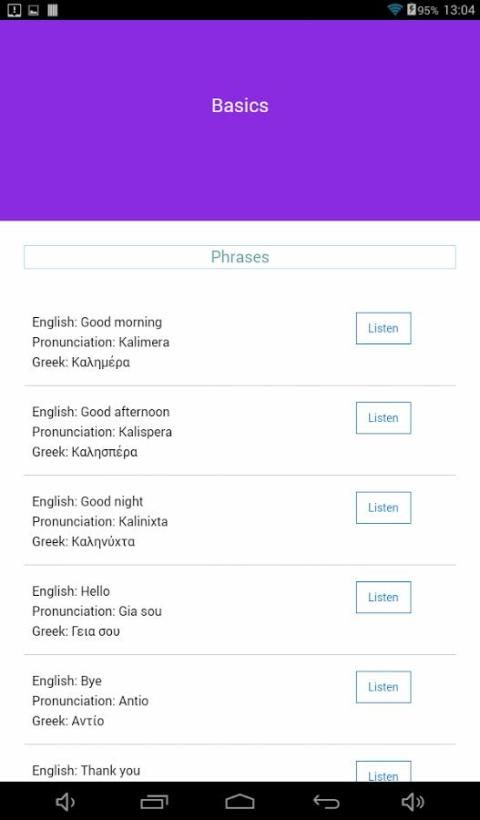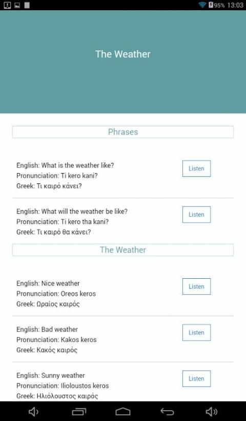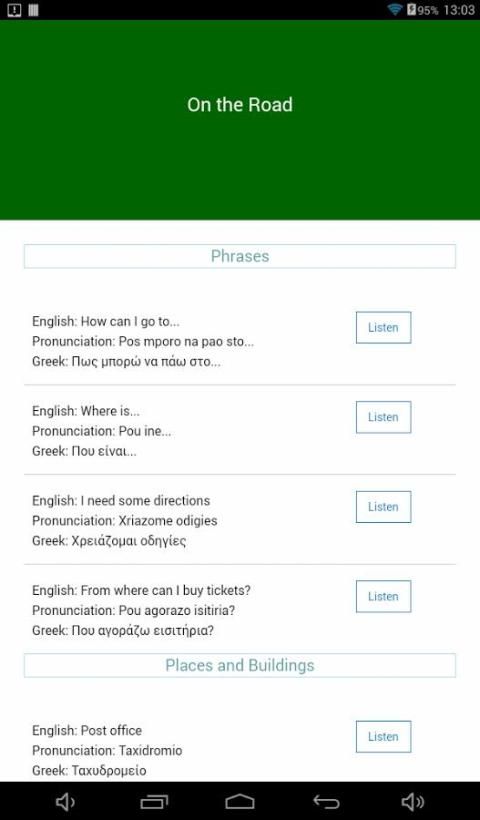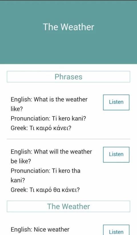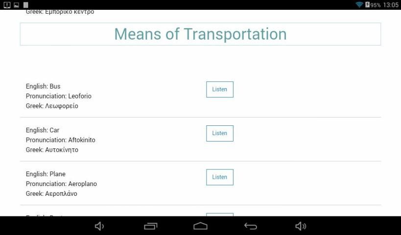 Konten tersebut dibagi menjadi beberapa kategori berdasarkan topik dan itu terdiri dari frase dan dialog dengan arti bahasa Inggris, terjemahan Yunani dan file audio untuk mendengarkan pengucapan.