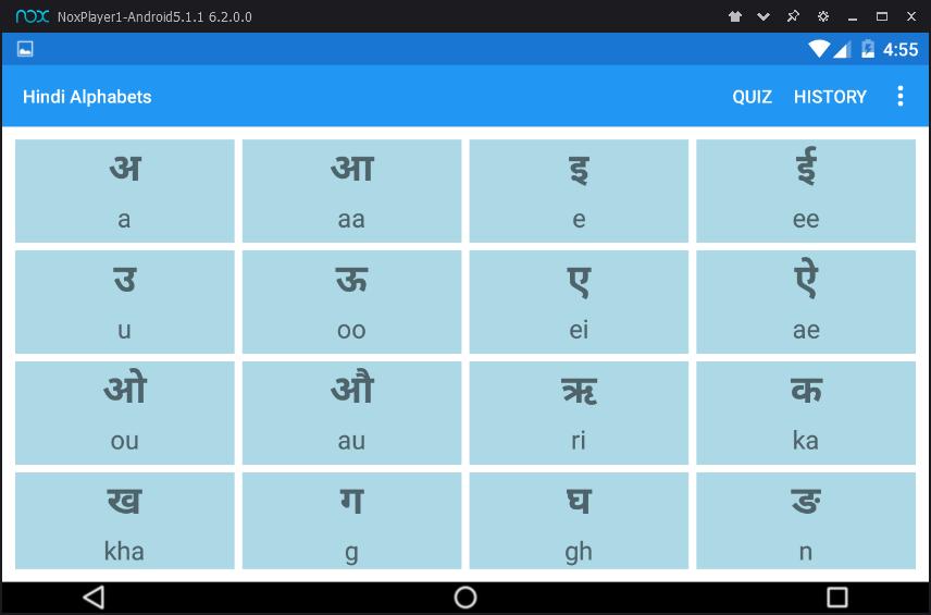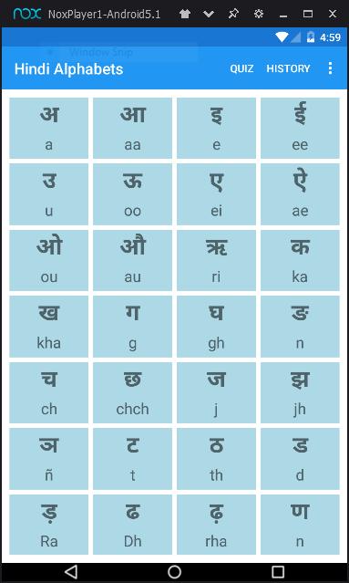 'Learn Hindi - Basics' app is an easy to use and unique application with self descriptive interface. The basic idea of this application is to help the user to learn basic Hindi Letters with the help of easy quiz. Here, you can quickly start memorizing core letters, and use them to build simple words. These words are shown as an example with pronunciation and meaning in English Language