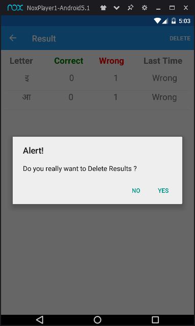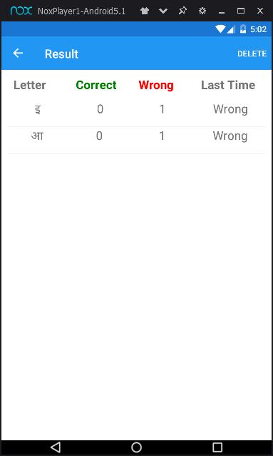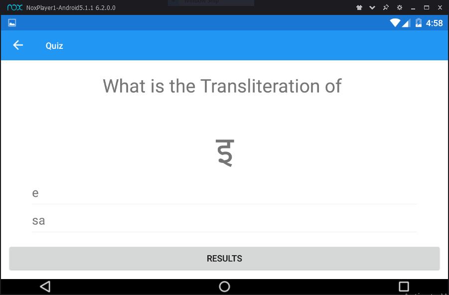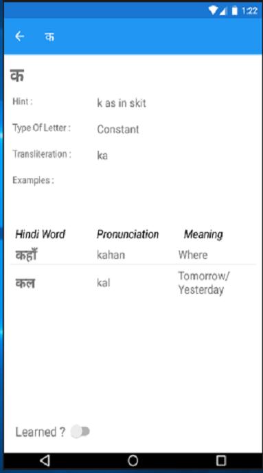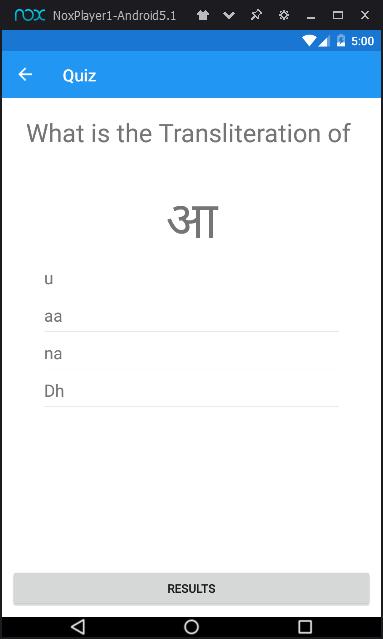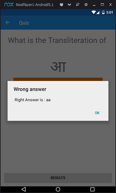 There is also a quiz based on the letters learnt by the user. Here some random questions are asked based on Transliteration. Hence, Quiz as an additional feature, will help the user to track his/her progress on the number of letters that have been learnt.