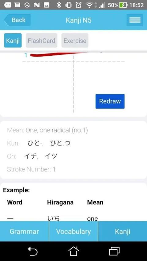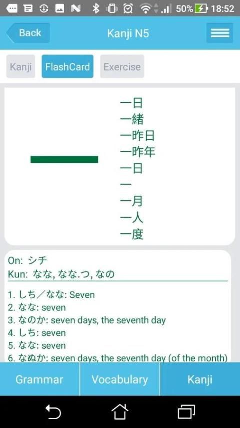 Pada bagian Kanji Anda dapat berlatih menulis, -kun dan pengucapan -on melalui contoh. Apalagi dengan flashcards akan membuat lebih mudah bagi Anda untuk belajar dan mengingat, setelah setiap pelajaran akan memiliki latihan pilihan ganda bagi Anda untuk berlatih.