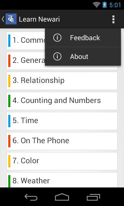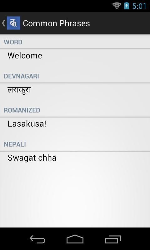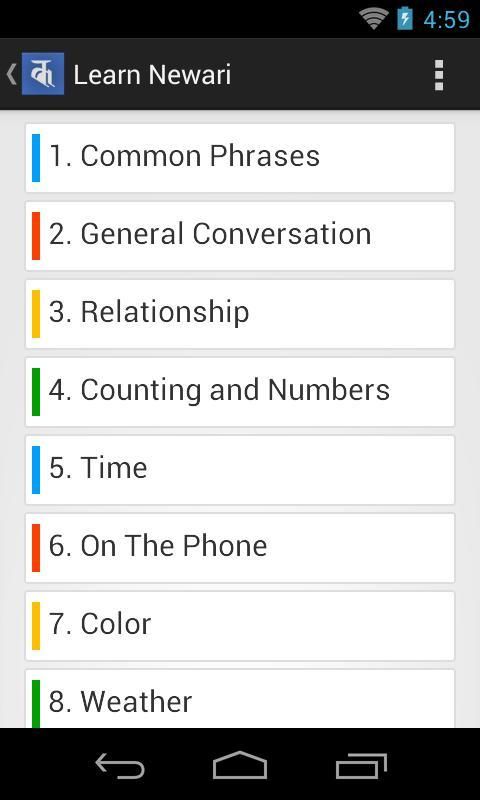 Aplikasi ini kami telah menciptakan sebuah platform sehingga pelajar dapat belajar kata-kata dasar dan garis yang digunakan dalam percakapan umum. Bagian belajar dibagi menjadi beberapa kategori kata / kalimat seperti Conversation Umum, Hubungan, Makanan, Warna dan Nama Hewan dan banyak lagi. Selain memberikan berbagai kata / frase, juga menyediakan makna masing-masing dalam bahasa Inggris, Nepal Bhasa Devanagari, Nepal Bhasha diromanisasi dan Nepal.