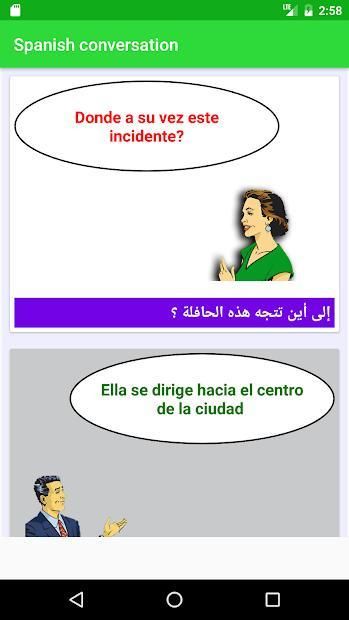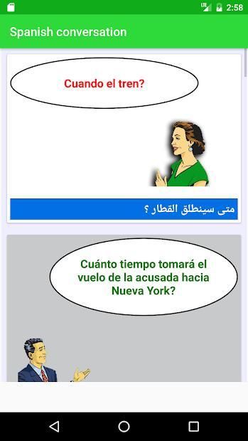 في هذا التطبيق الذي يشرح الاسبانية عن طريق محادثات بين شخصين يجعل المتلقي يفهم المفردات اللغة الاسبانية ، بحيث يتكون على محادثات في القطار و المطار ، في محطة القطار ، الحافلة ، عند الطبيب و أيضا محادثات التعارف في اللغه الاسبانية .